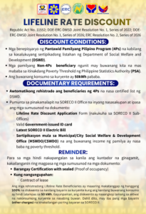 Ang Lifeline Rate Discount ay ibinibigay sa mga pamilyang may mababang kita upang makatulong sa kanilang bayarin sa kuryente. Maaaring makakuha ng diskwento kung: ✔ Benepisyaryo ng 4Ps na nasa certified list ng DSWD ✔ Non-4Ps ngunit may kita na mas mababa sa poverty threshold ng PSA ✔ May buwanang konsumo na 50 kWh pababa […]