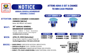 📢 ATTENTION, Ka-MCOs! Inaanyayahan ang lahat ng miyembro ng SORECO II na dumalo sa ika-35th Annual General Membership Assembly (AGMA) sa darating na April 25, 2026 (Sabado). 🎉 Dumalo at magkaroon ng pagkakataong manalo ng cash prizes! 𝗧𝗮𝗻𝗱𝗮𝗮𝗻: 𝗡𝗼 𝗣𝗿𝗼𝘅𝘆 𝗔𝗹𝗹𝗼𝘄𝗲𝗱 📲 Maaari na kayong mag-register online! I-scan lamang ang QR code na nasa ibaba. […]